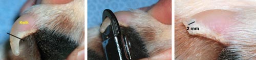 Anda harus mengetahui bagian mana dari kuku yang harus digunting. Pendarahan terjadi jika pembuluh darah dikuku atau biasa disebut dengan “kwik” ikut terpotong. Sisakan kuku sekitar 2 mm setelah pembuluh darah. Pembuluh darah akan ikut bertambah panjang sejalan dengan pertumbuhan kuku. Jika kuku anjing terlalu panjang maka pemotongan kuku tidak bisa sekaligus karena pembuluh darah dikuku pasti akan terpotong dan mengakibatkan pendarahan. Jika pembuluh darah bisa mengikuti panjangnya kuku berarti pembuluh darah juga bisa ikut mundur seiring dengan terpotongnya kuku. Untuk kuku yang sudah terlalu panjang sebaiknya dipotong secara bertahap setiap hari.