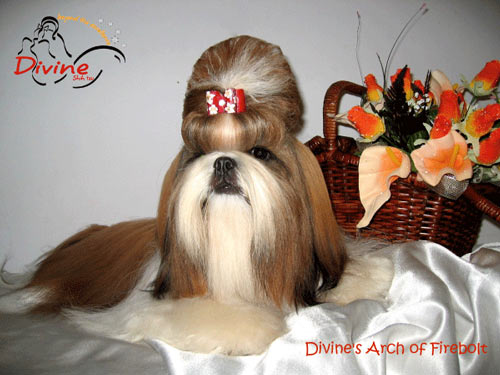 Red and white Shih Tzu with so nice black eyes, big head, excellent structure, good movement, and solid pigmen.