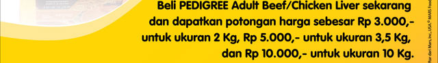 Beli PEDIGREE Adult Beef/Chicken Liver sekarang dan dapatkan potongan harga sebesar Rp.3.000,- untuk ukuran 2 Kg, Rp.5.000,- untuk ukuran 3,5 Kg, dan Rp.10.000,- untuk ukuran 10 Kg.