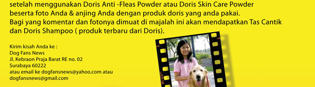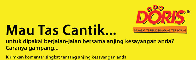 Dapatkan tas cantik dari DORIS dengan mengirimkan komentar singkat tentang anjing anda setelah menggunakan produk dari DORIS dan juga disertai dengan foto anda dan anjing anda dan tentu saja dengan produk dari DORIS.