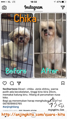 Hari Jumat, 3 Maret 2017 jam 12-13.00 siang di perumahan Nusa Loka BSD Tangerang hilang karena keluar dari pagar garasi rumah. Mohon bantuannya apabila ada yang melihat chika seperti gambar terlampir dapat menghubungi Ibu Feci di no hp 087809993765, terima kasih.