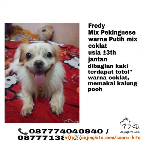 Ciri khusus terdapat totol-totol warna coklat dibagian kaki dan kepalanya, bulu anjing halus dan panjang tetapi tidak lebat, namanya fredy tapi kami biasa memanggilnya flediii dengan i yang panjang ketika namanya dipanggil ia akan menoleh, mengongong dan mengibaskan ekor, bagian ekor berbentuk kipas dengan bulu yang panjang, memakai kalung pooh.