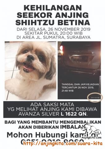 Hilang Anjing Shih Tzu Betina pada tanggal 26 November 2019 malam hari. Ciri2 no. Tatoo B1D92 warna 3 color dominan putih, umur 8th, gendut. Hilang disekitar jl Sumatera Surabaya. Ada saksi mata melihat anjing di bawa mobil Avanza Silver L 1622QN.