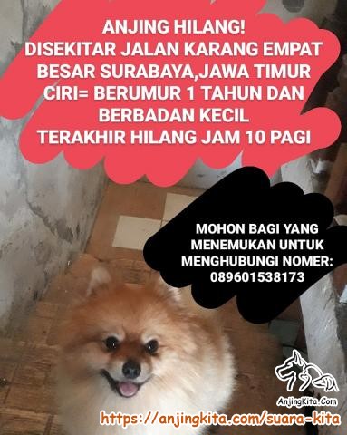 anjing hilang,Jenis anjing pomeranian, laki laki umur setahun lebih hilang di daerah karang empat besar surabaya.Mohon bagi yang menemukan atau melihat anjing serupa bisa menghubungi nomer : 089601538173 atau 08123039919 akan diberikan imbalan.mohon bantuannya