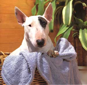 Ukuran dan berat badan anjing Bull Terrier jantan dan betina adalah sama. Tinggi 12 in, berat 12 Kg.
