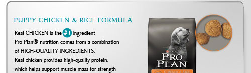 Each formulation has real chicken, beef or lamb as the #1 ingredient for a high quality source of protein, plus all essential nutrients to help bolster his immune, digestive, and skin & coat system. PROPLAN® Dry Puppy Formula contain DHA, a nutrient also found in mother’s milk, for proper brain and vision development.