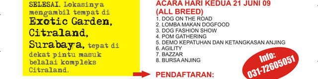 Ikuti dan saksikan berbagai lomba menarik untuk anda dan anjing anda, bazzar produk untuk anjing, bursa anjing dijual, demo anjing pintar dan lain sebagainya.